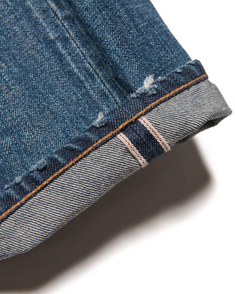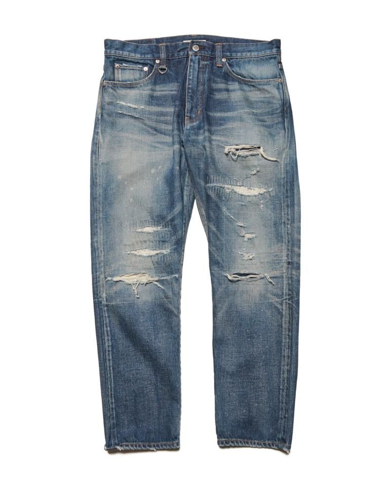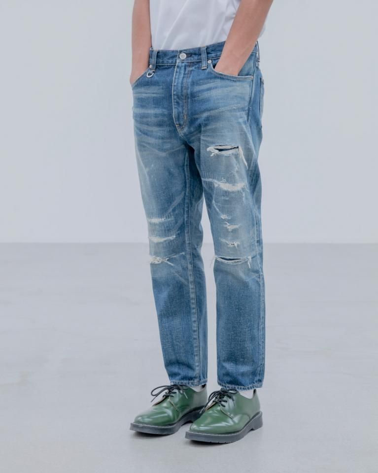 ナチュラルな色落ち、クラフト感のあるダメージやリペアによって長年穿き込んだようなルックスを実現したテーパードジーンズ。ヴィンテージライクなアイテムながら、腿周りから裾にかけてゆるやかに細くなっていくシルエットが現代のスタイルに難なくフィットします