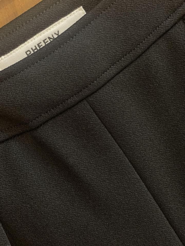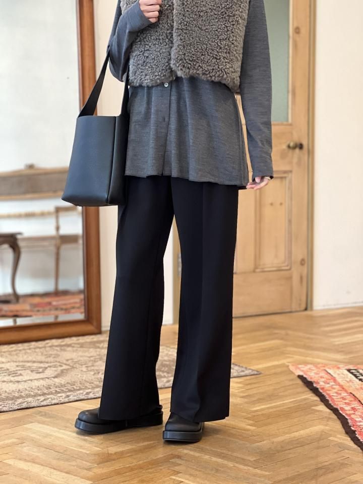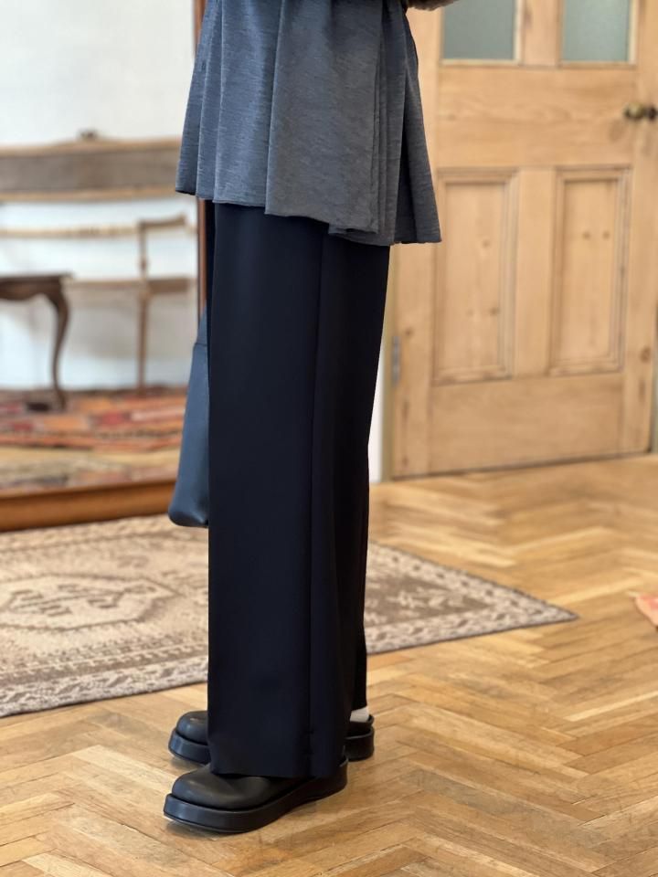 定番のアムンゼンワイドパンツ。すとんと綺麗に落ちるワイドストレートにセンタークリースを加え、縦ラインをすっきり引き立てるデザイン。