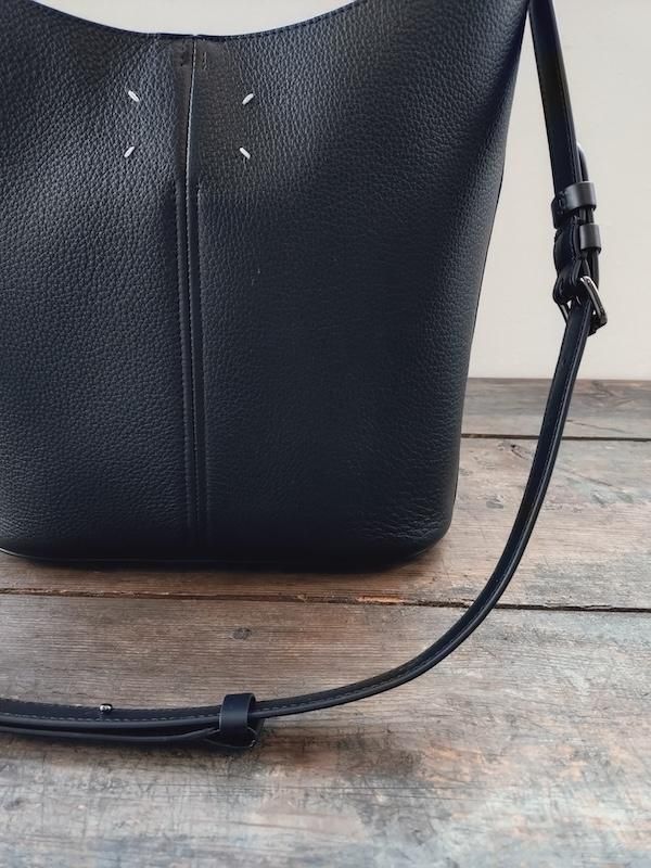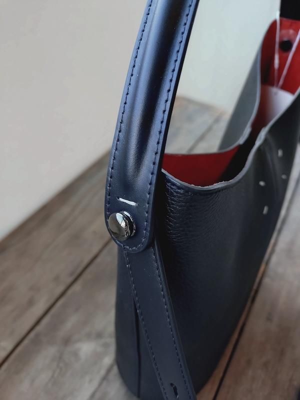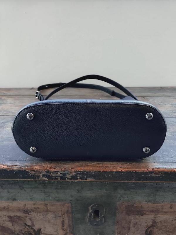 このスモールサイズのハンドバッグは、クラシカルなレザーワークと